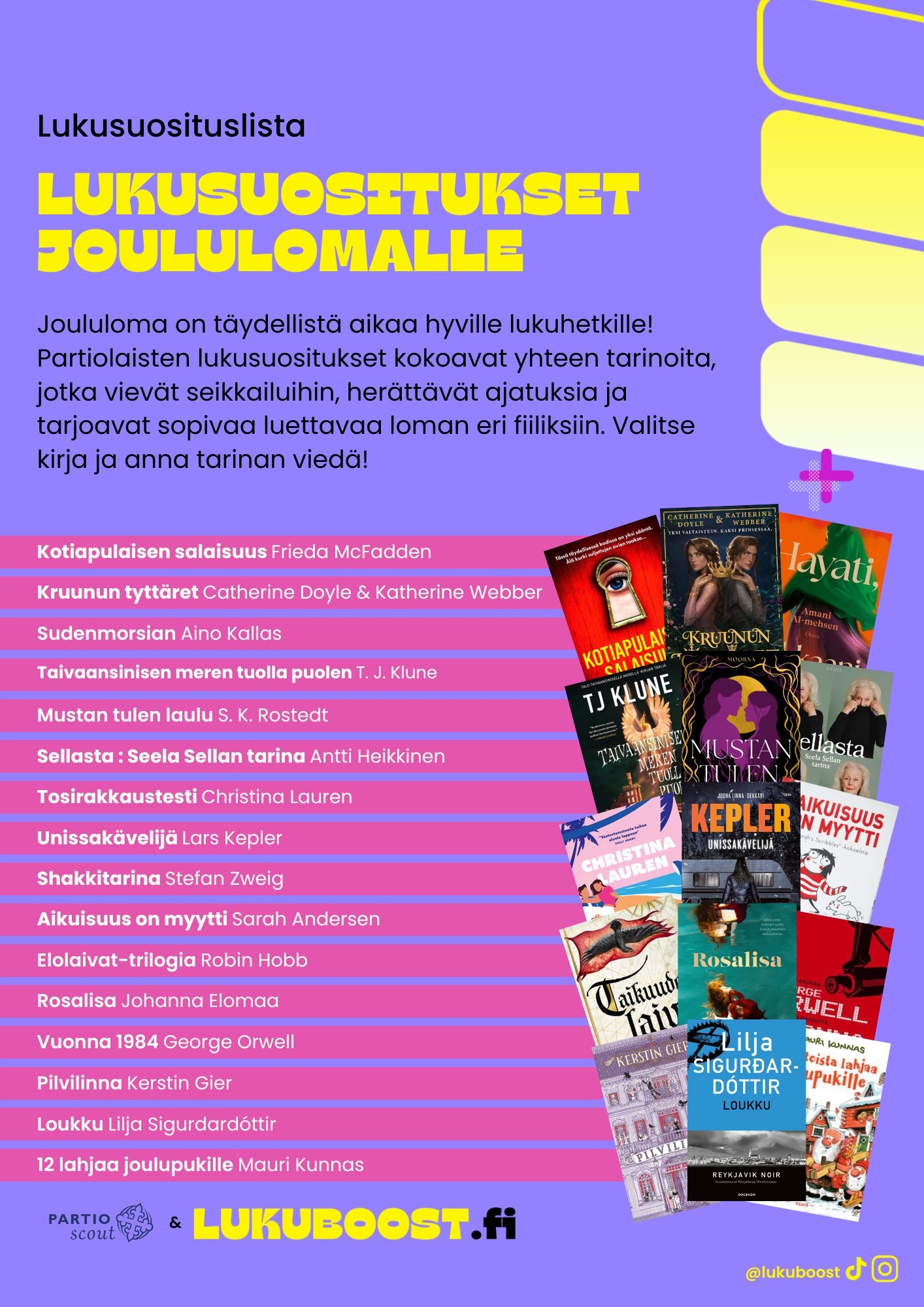 Jos kaipaat lukuinspiraatiota, ota tästä talteen Lukuboostin lukusuosituslistat. Listat on kerätty suoraan nuorilta sekä kampanjan somevaikuttajilta, ja niiltä löytyy monenlaista luettavaa ihan jokaiselle!